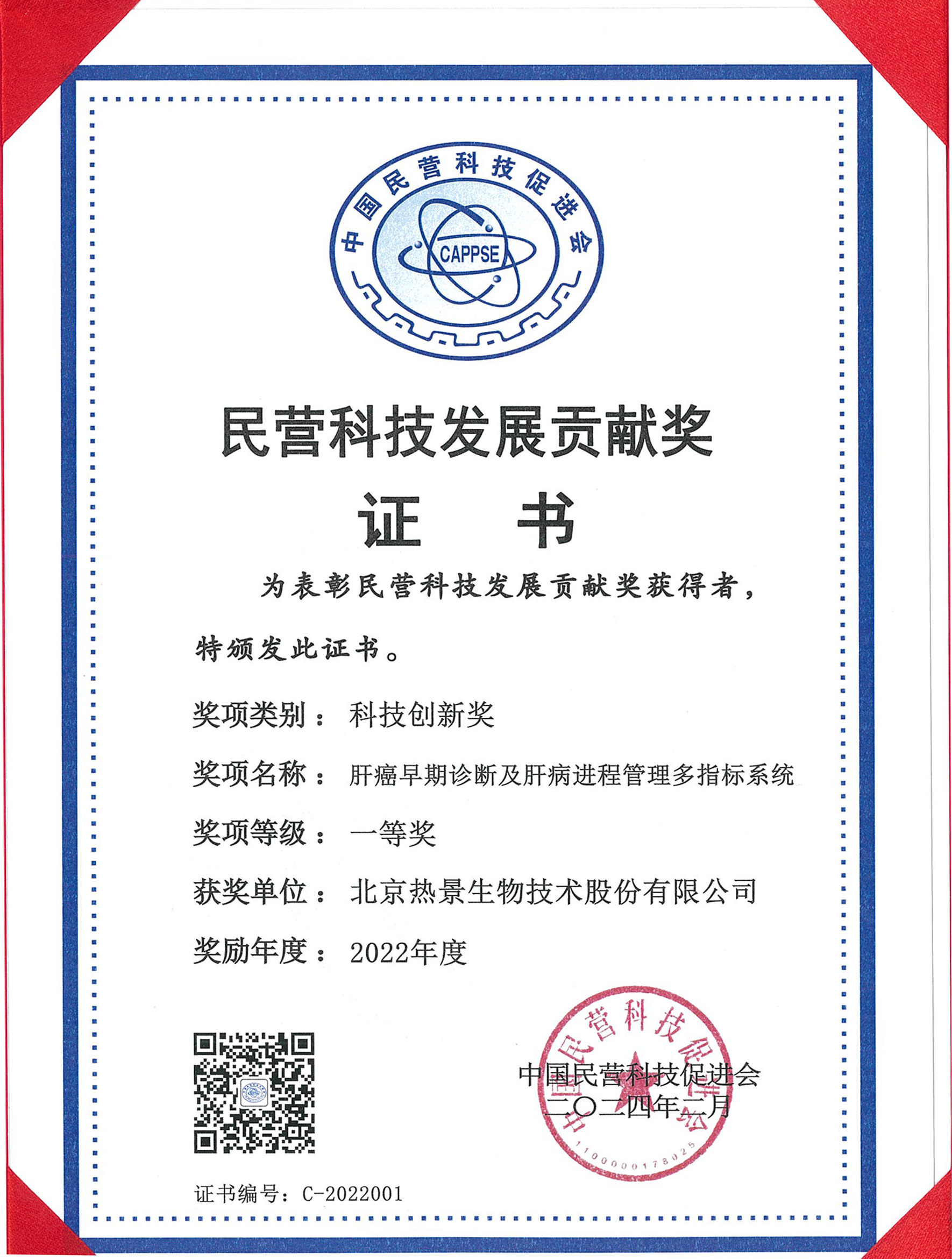 近日,中国民营科技促进会公布了“2022年度民营科技发展贡献奖”获奖企业名单,热景生物“肝癌早期诊断及肝病进程管理多指标系统”项目荣获“2022年度民营科技发展贡献奖”科技创新一等奖。