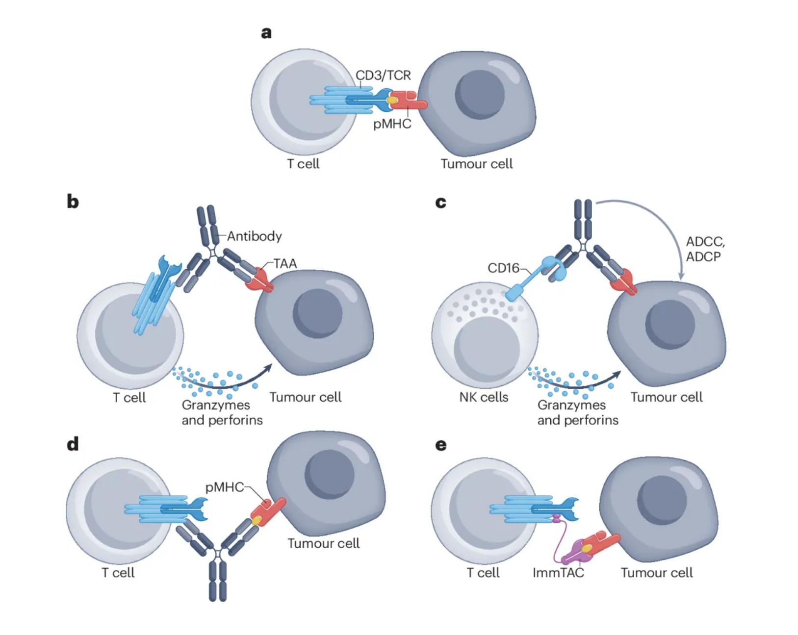 具体来说,靶向T细胞、自然杀伤(NK)细胞或巨噬细胞-粒细胞上表达的抗原的双特异性抗体,如CD3、CD16(FcγRIIIa)或CD64/SIRPα,能够使潜在的各种免疫效应细胞选择性地转向肿瘤特异性靶抗原。而设计用于靶向一种以上肿瘤特异性细胞表面抗原的双特异性或多特异性抗体能够更精确地区分恶性细胞和非恶性细胞,并可能比单克隆抗体更能提高治疗活性。